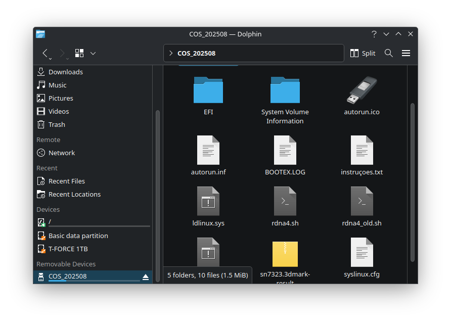 Apesar de muitos terem horror, preconceito ou trauma passado com o Linux, rodar o script é muito simples! O primeiro passo é criar um pendrive bootavel com alguma distro LiveCD, aqui usei o CachyOS, mas pode ser qualquer outro da sua preferência. Além disso, copie os arquivos dos scripts (o rdna4.sh e o rdna4_old.sh) na raiz do pendrive.