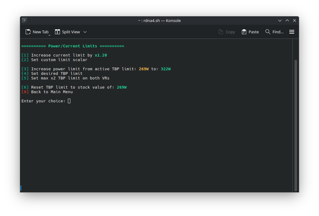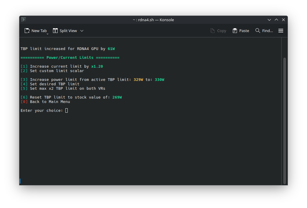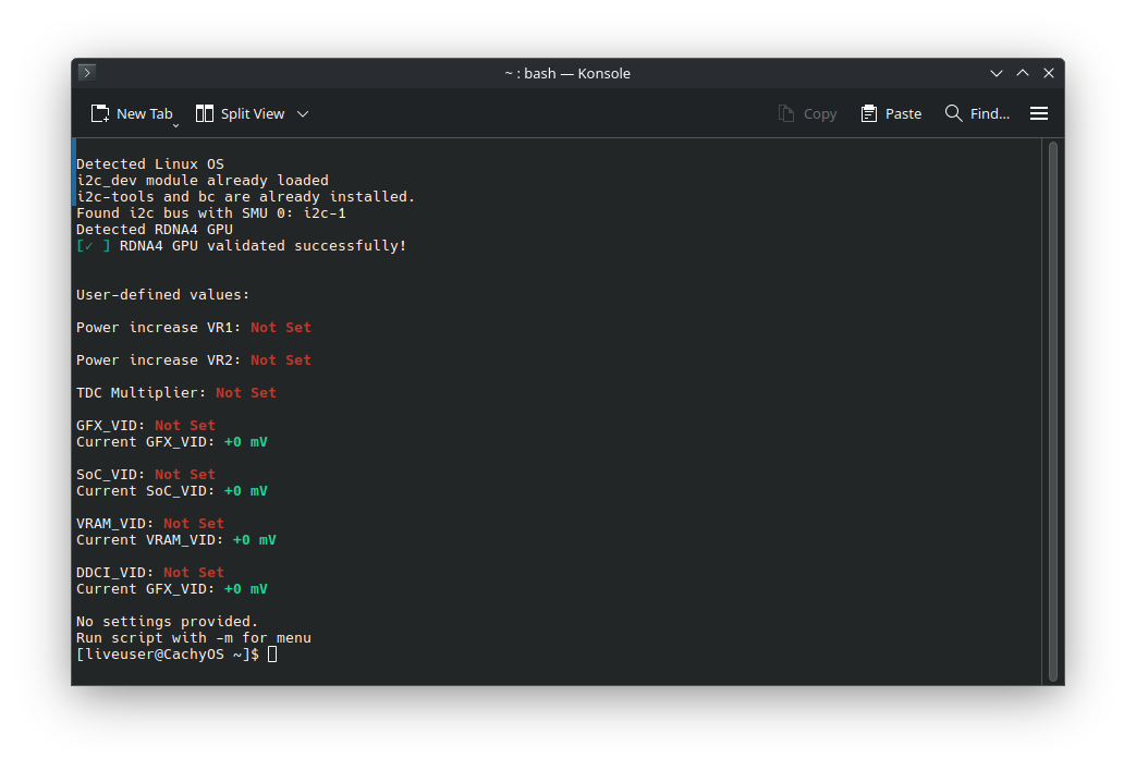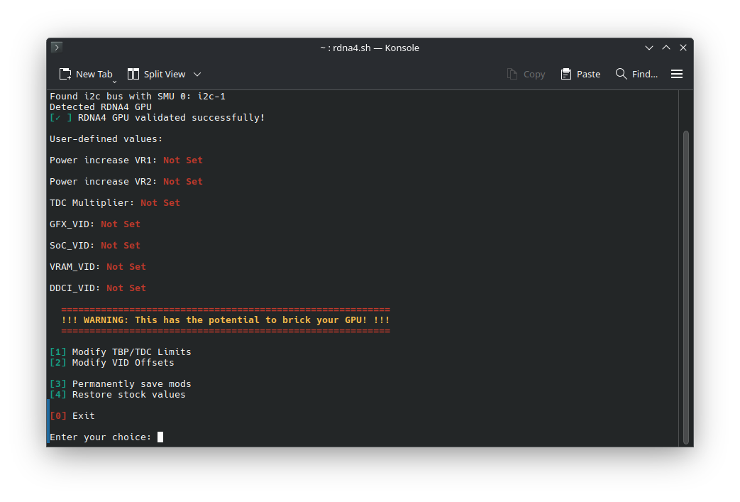 Feito isso, copie a versão correta do script para a pasta /home, isso é importante, já que é necessário rodar o script a partir de um sistema de arquivos Linux. A partir dai, abra o terminal na pasta /home e rode o comando chmod +x rdna4.sh (ou rdna4_old.sh), que dá permissões para o script rodar como executável, bastando dai dar um ./rdna4.sh para executar-loe ver as configurações ativas e um ./rdna4.sh -m para abrir o menu que permite alterar os parâmetros (PPT, TDC, offsets de tensão).