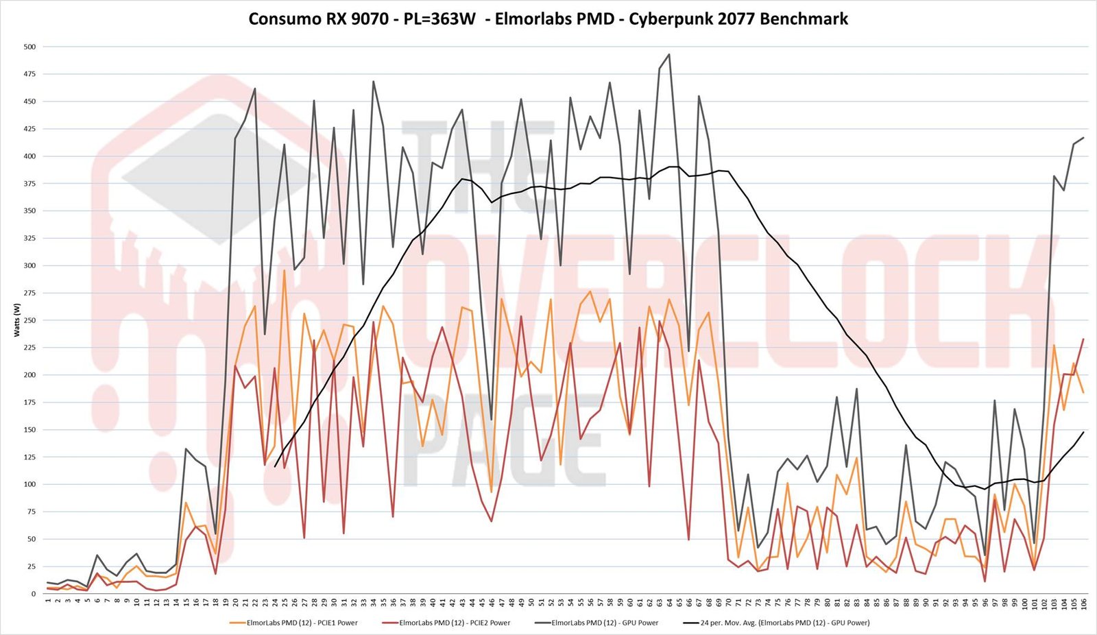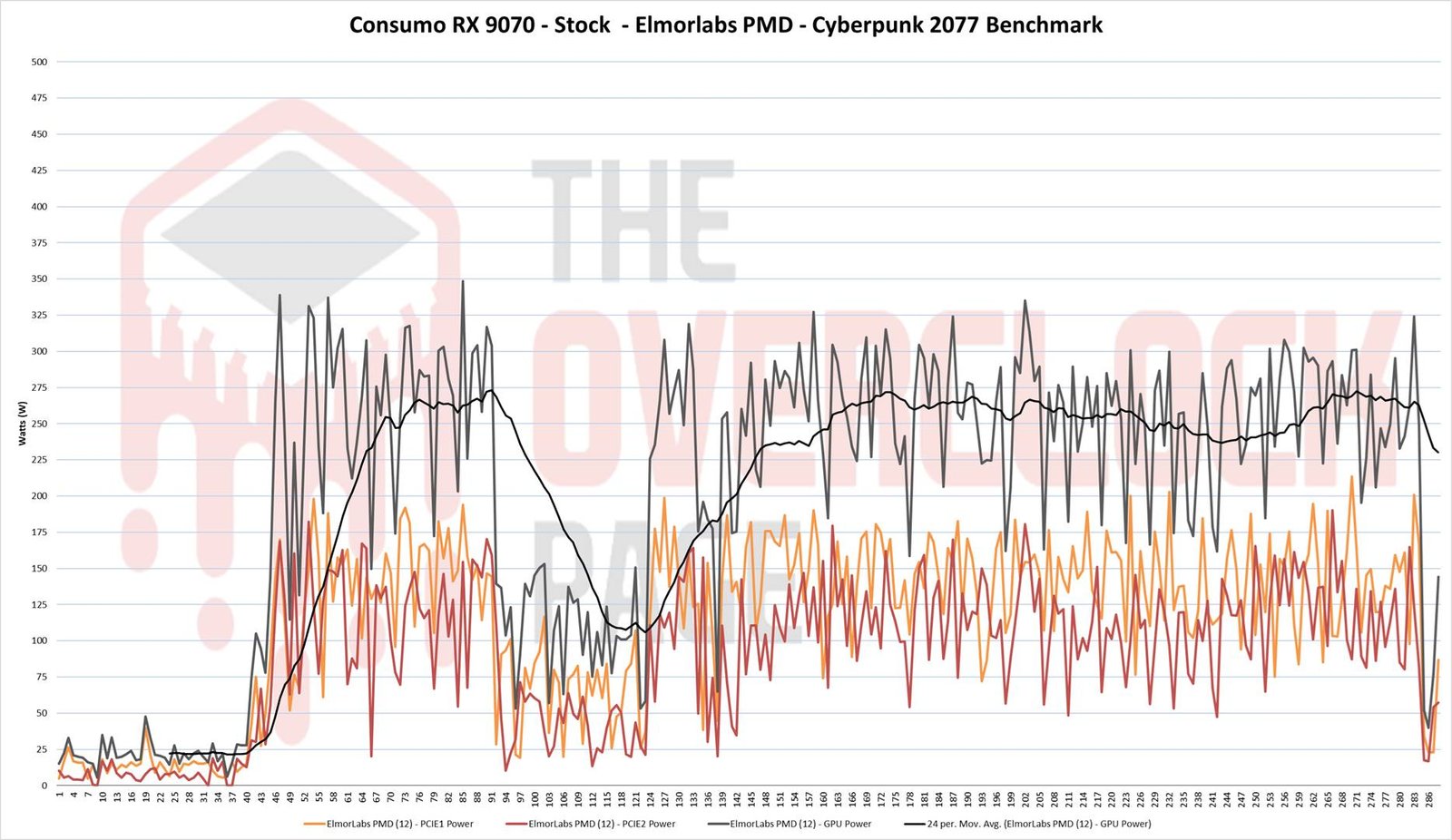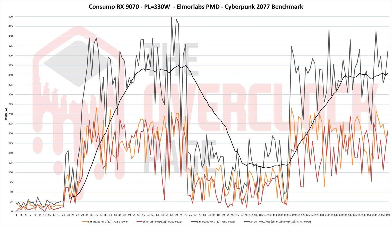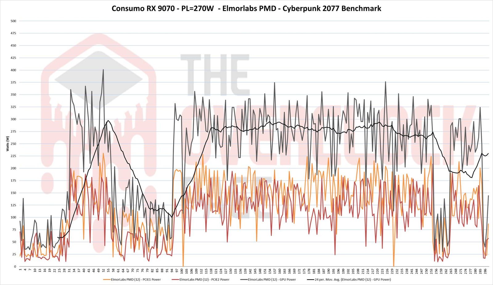Ao aumentar o Power Limit em +10%, o que resulta em aproximadamente 270W, ai a RX 9070 ficou entre 275 e 300W, com ocasionais spikes em 375W e um ‘recorde’ em 400W!