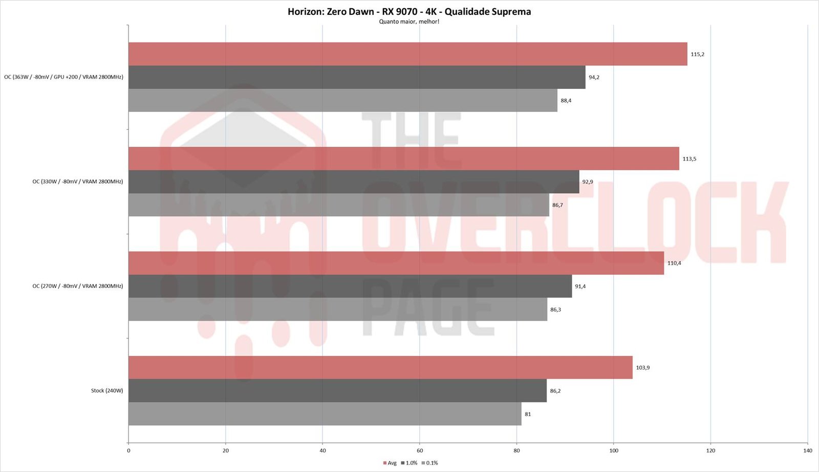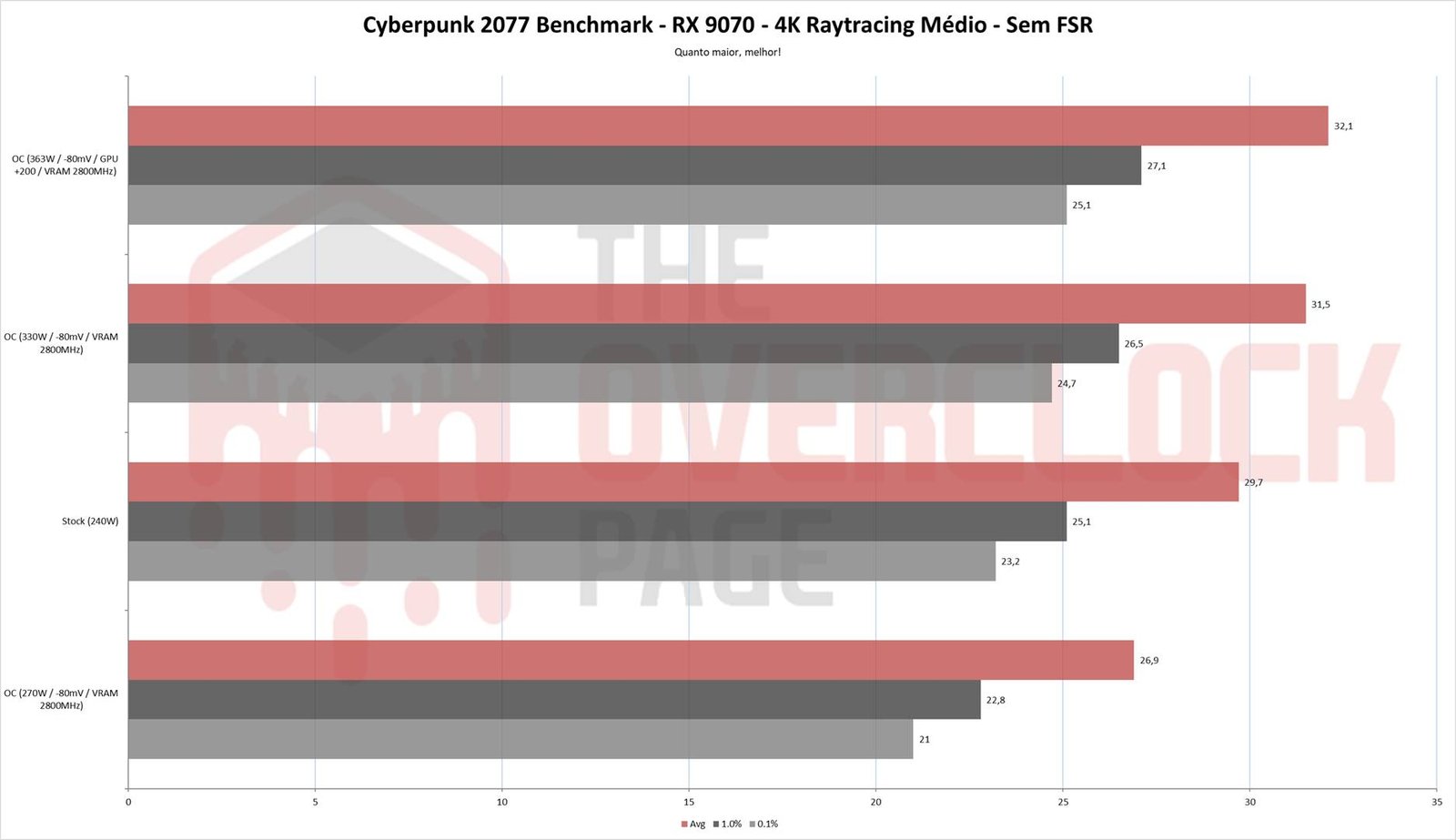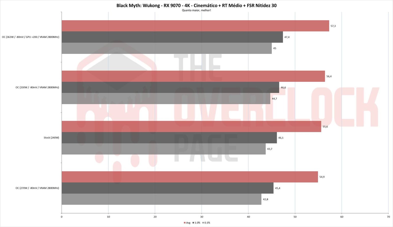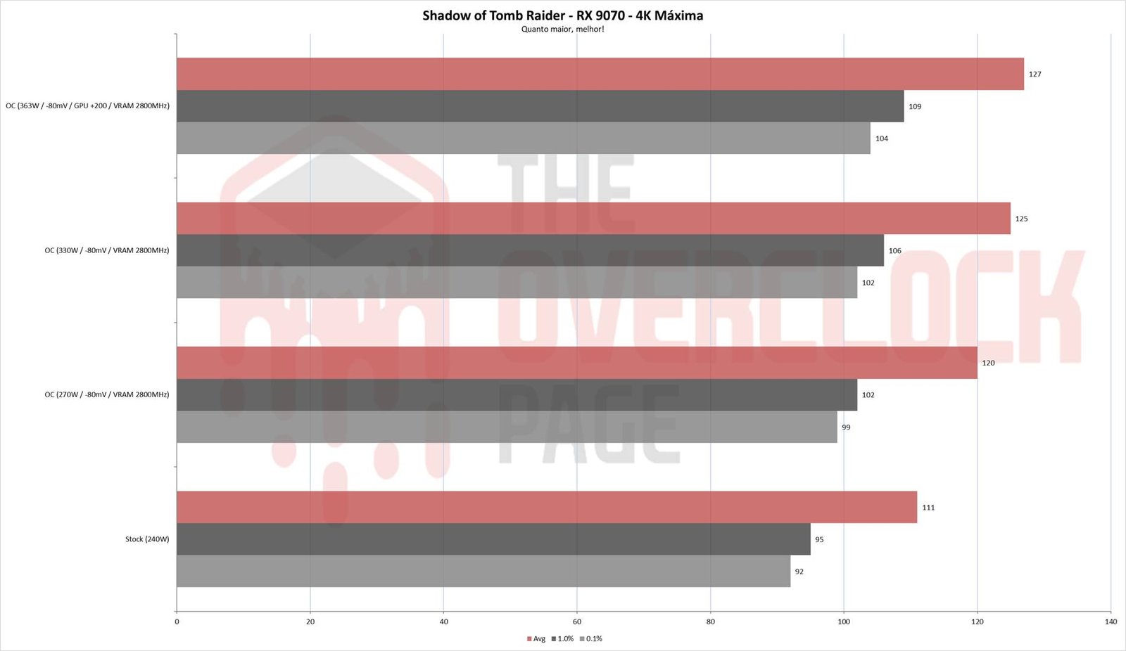 Ao liberar até 363W de TDP e fazer undervolt com overclock nas memórias, foi possível obter um ganho médio de desempenho de quase 13% em relação ao padrão dessa RX 9070, efetivamente colocando-a no mesmo patamar ou até mesmo acima de uma RX 9070 XT padrão, isso por um custo de aquisição menor, o que é bem legal e de certa forma, nostalgico, já que lembra os tempos antigos em que comprar o modelo mais barato e fazer overclock até chegar no desempenho do maior era lei.