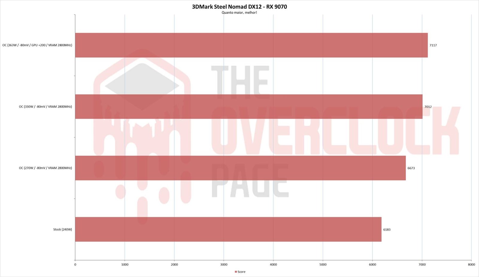 Sobre os benchmarks, foram escolhidos o 3DMark Steel Nomad, Black Myth: Wukong, Cyberpunk 2077, Horizon: Zero Dawn e Shadow of the Tomb Raider (SOTTR) e usadas as ferramentas de benchmark integradas, já que o intuito aqui é verificar como ficou o ‘scaling’ da RX 9070 com os ajustes e power limit adicionais.