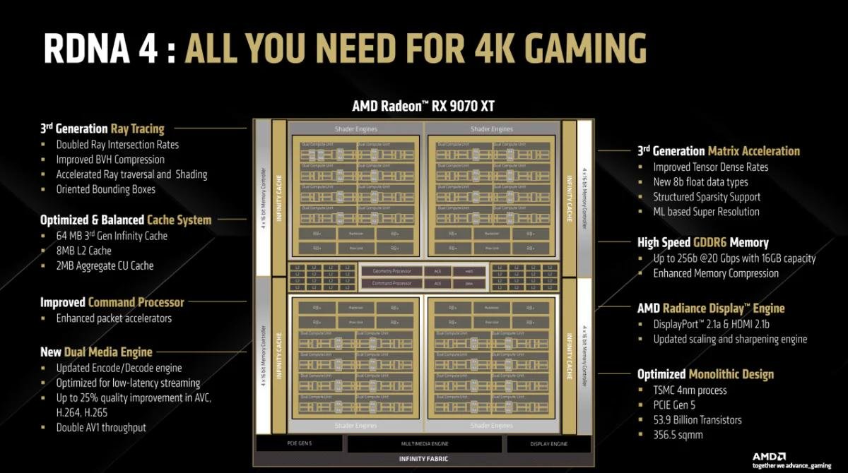 Em relação a RDNA3, praticamente tudo melhorou! O desempenho em Ray Tracing evoluiu pra algo usável, o novo media engine resolveu os gargalos que existiam para o pessoal que faz livestream ou gravação e a unidade de aceleração de matrizes agora suporta FP8, o que é usado pelo FSR4.