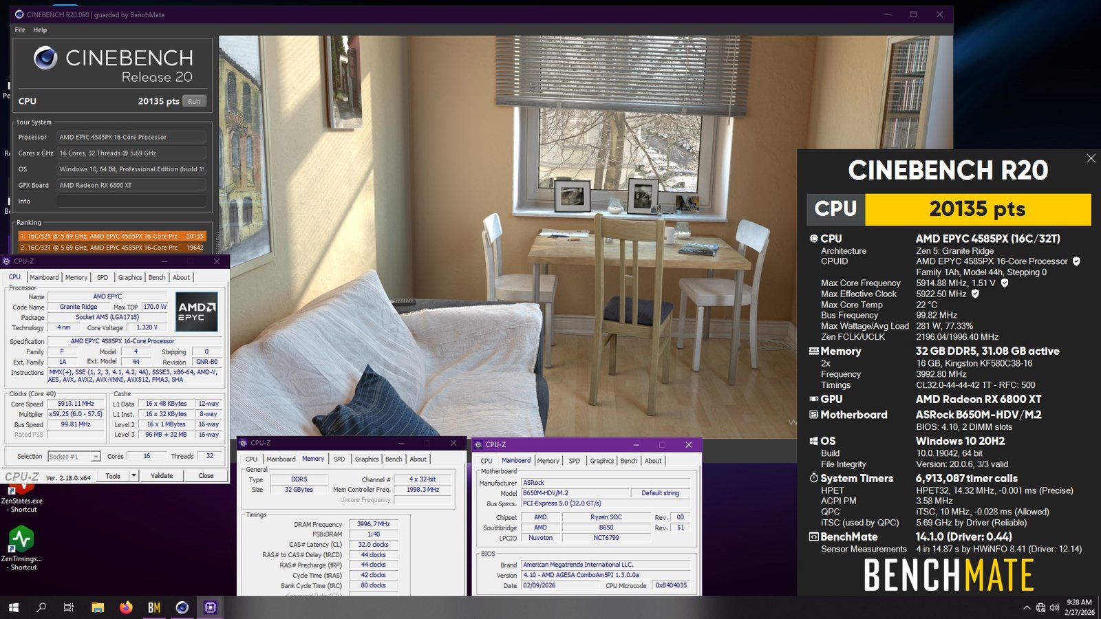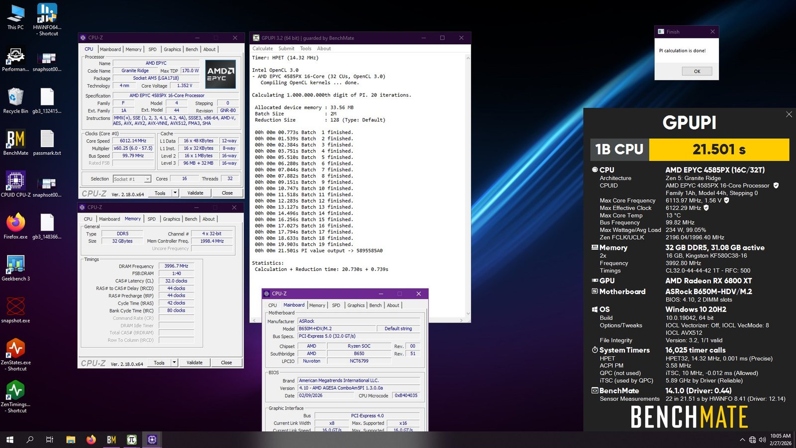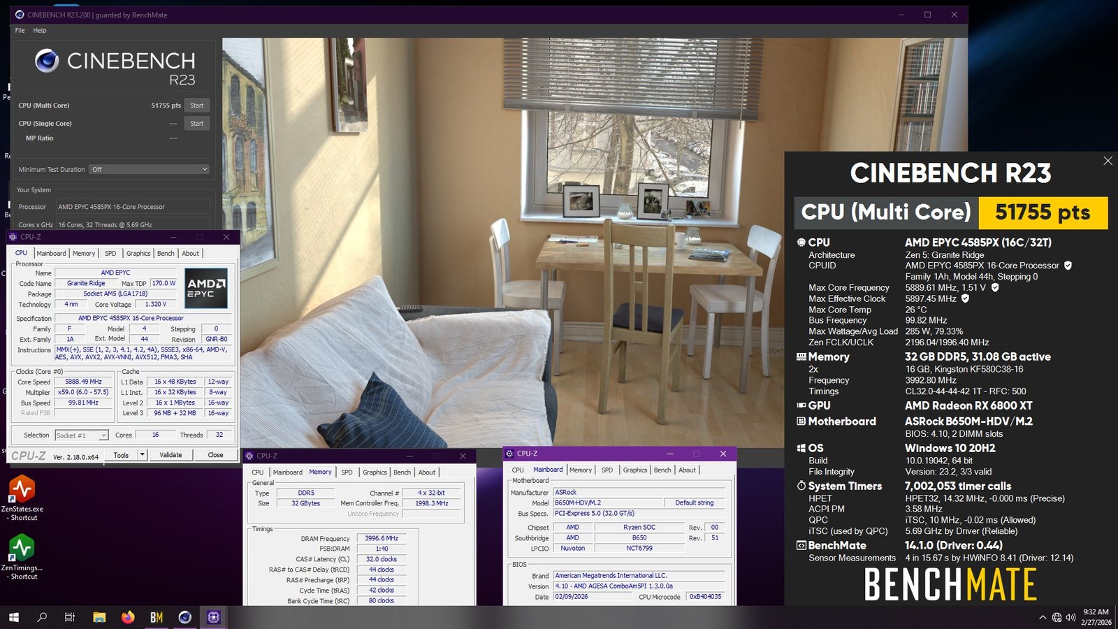 O próximo foi o poderoso 4585PX, o qual finalizou os benchmarks com frequências entre 5550 e 6100 MHz, com vcore entre 1.25~1.34V, o que é uma marca bem razoável para gelo seco! Além disso, aqui a ASRock B650M-HDV/M.2 colaborou e foi possível rodar os testes com a RAM cravada em 8000 MT/s.