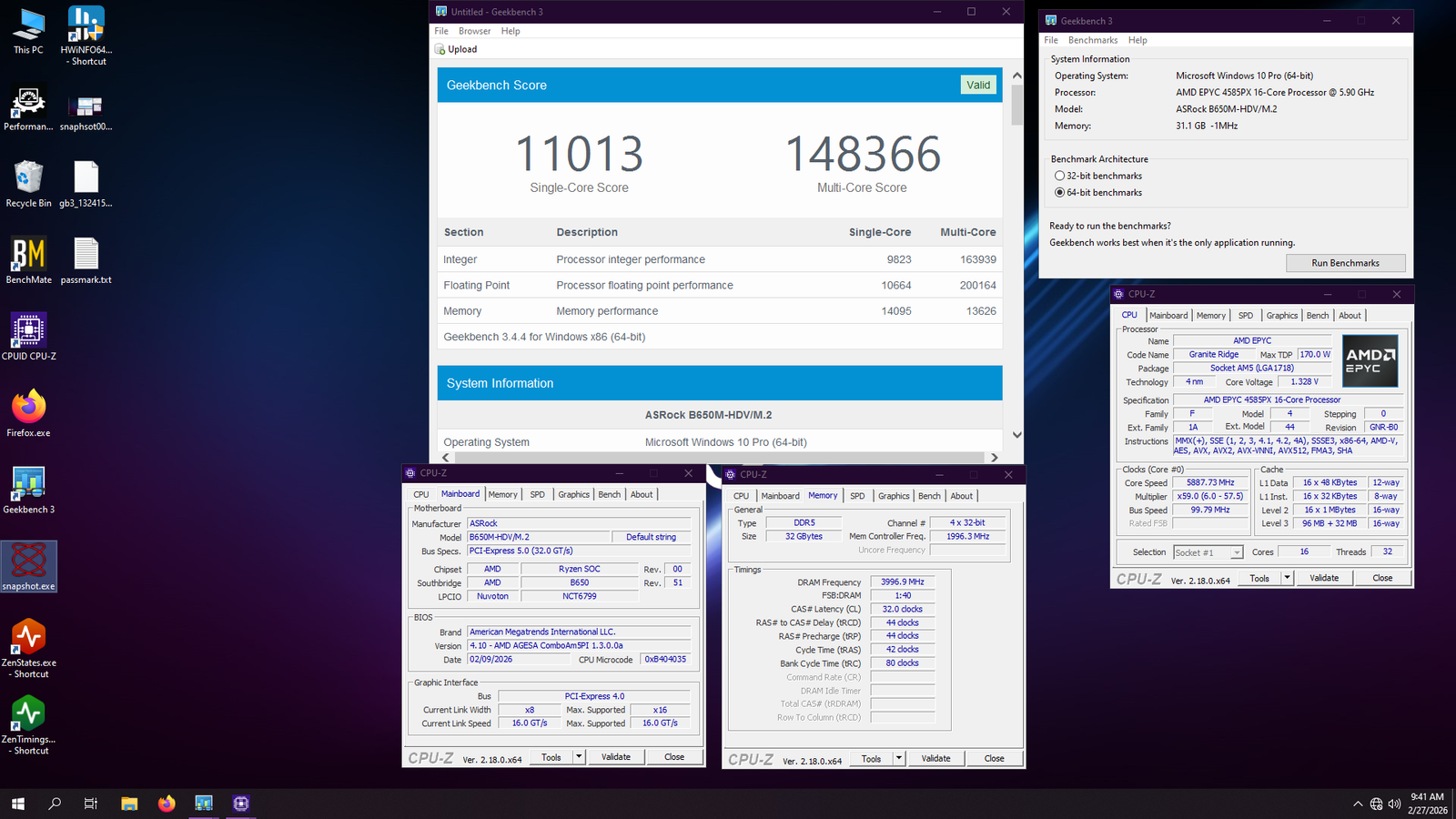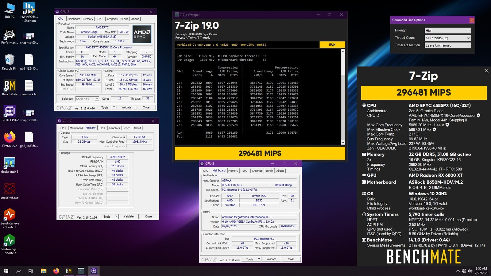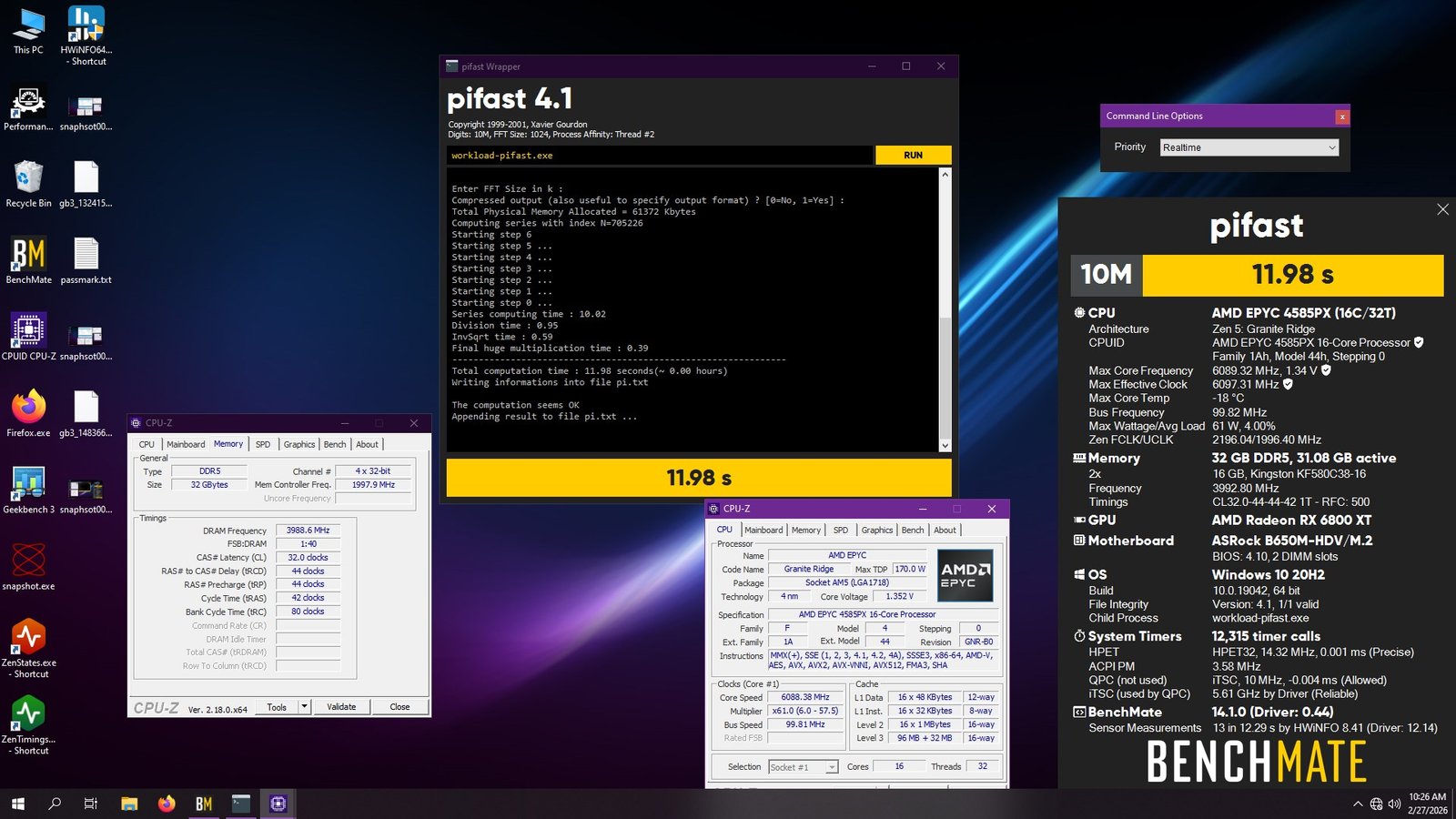 O próximo foi o poderoso 4585PX, o qual finalizou os benchmarks com frequências entre 5550 e 6100 MHz, com vcore entre 1.25~1.34V, o que é uma marca bem razoável para gelo seco! Além disso, aqui a ASRock B650M-HDV/M.2 colaborou e foi possível rodar os testes com a RAM cravada em 8000 MT/s.